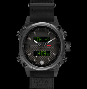 THE BLACK AIR STRYK II is an update of the MTM Air Stryk series. As it's predecessor, the BLACK AIR STRYK II is not just rugged in its looks and durability and offers an imposing array of valuable and unique functions. Besides bold, easy to read under all conditions, analog hands, the BLACK AIR STRYK II is lightweight titanium and incorporates a global GMT world-time function along with 5 daily digital alarms, a digital compass, chronograph mode, countdown timer and 24 hour time. All displayed in the two electro-luminescent, backlit display windows. The newly redesigned dial incorporates a carbon fiber lower half. Case plating options of DLC silver and matte gray are also available.